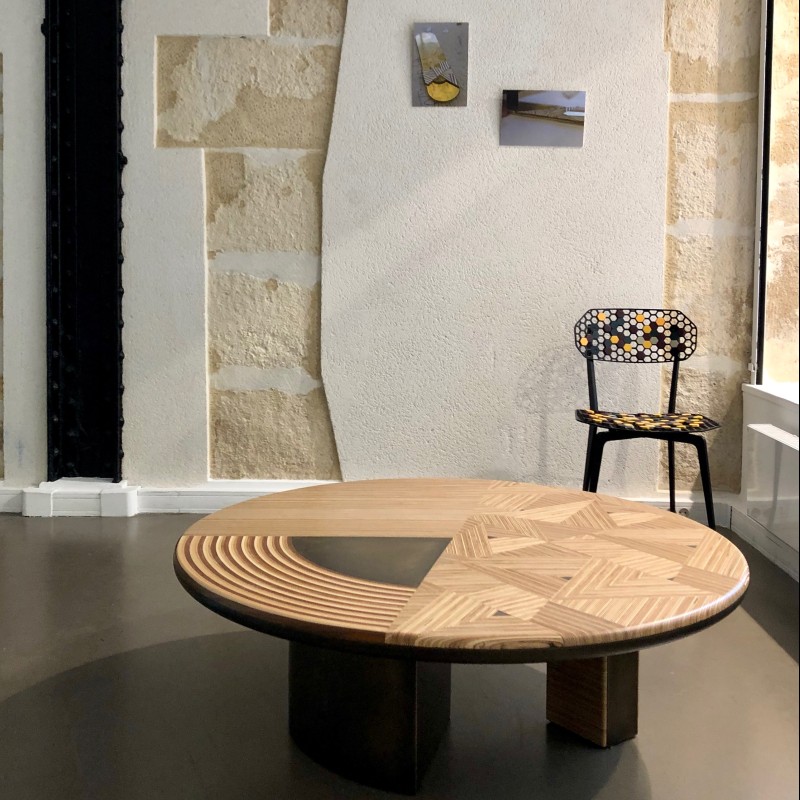 Les nouvelles pièces, dévoilées dans le cadre de cette exposition, sont réunies au sein de la collection Spiral - Cycle of Life qui regroupe une table, une table d’appoint, une table basse et quelques maquettes. Elaborées autour d’un travail minutieux de menuiserie, ces créations combinent différentes essences de bois (acajou, hêtre, chêne français et noyer américain) qui en forment le motif principal. Un travail dont la complexité se découvre au fil du regard pour dévoiler un savoir-faire exceptionnel. Les lames de bois une fois assemblées se complètent d’éléments en laiton pour créer une rythmique visuelle élégante et contemporaine.