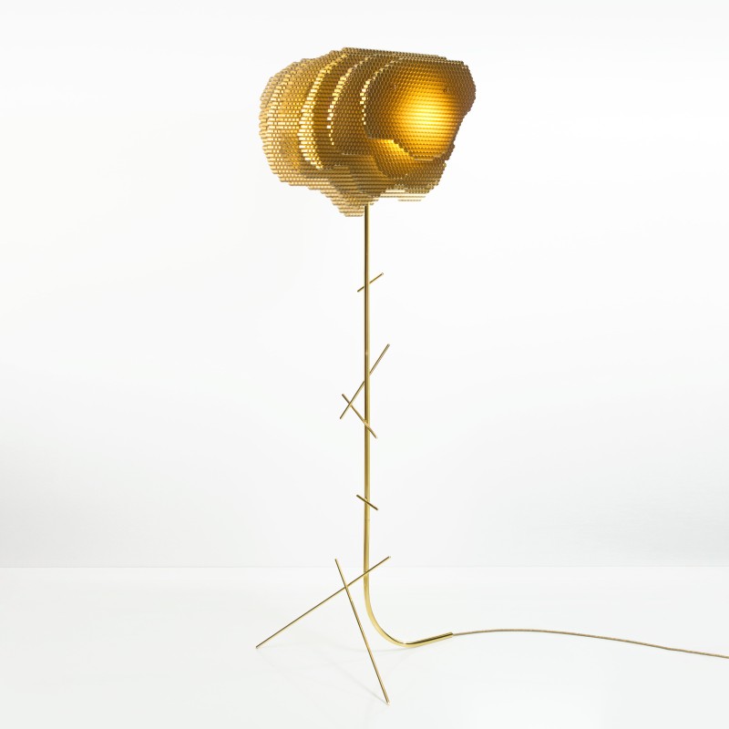 La lampe NIDA s'inspire d'un nid d'abeilles à l'état naturel. Elle est composée d'une structure en tranches de nid d'abeilles en aluminium aéronautique finition dorée. Les polygones offrent une diffraction cinétique de la lumière. Le piètement est composé d'un tube en inox cintré, équilibré par deux fines tiges en inox qui se croisent tels des rayons de soleil fichés dans le sol. L'ensemble du pied est traité à l'or 24 carats lui conférant une finition hors du temps.